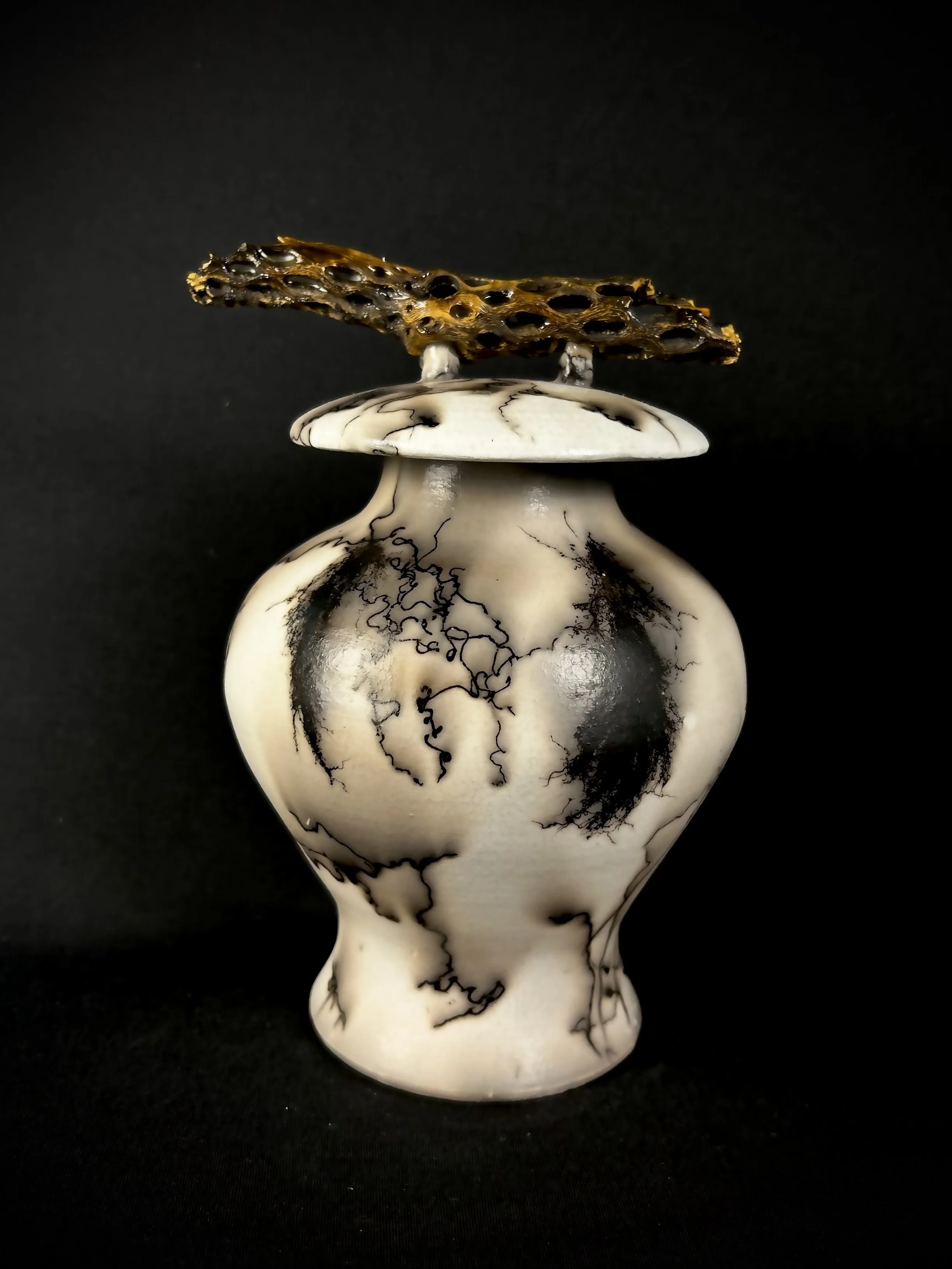 I design customized Cremation Urns, often using my Black Raku or Horsehair Raku technique. The lids are often adorned with blackened Cholla cactus from my garden.
